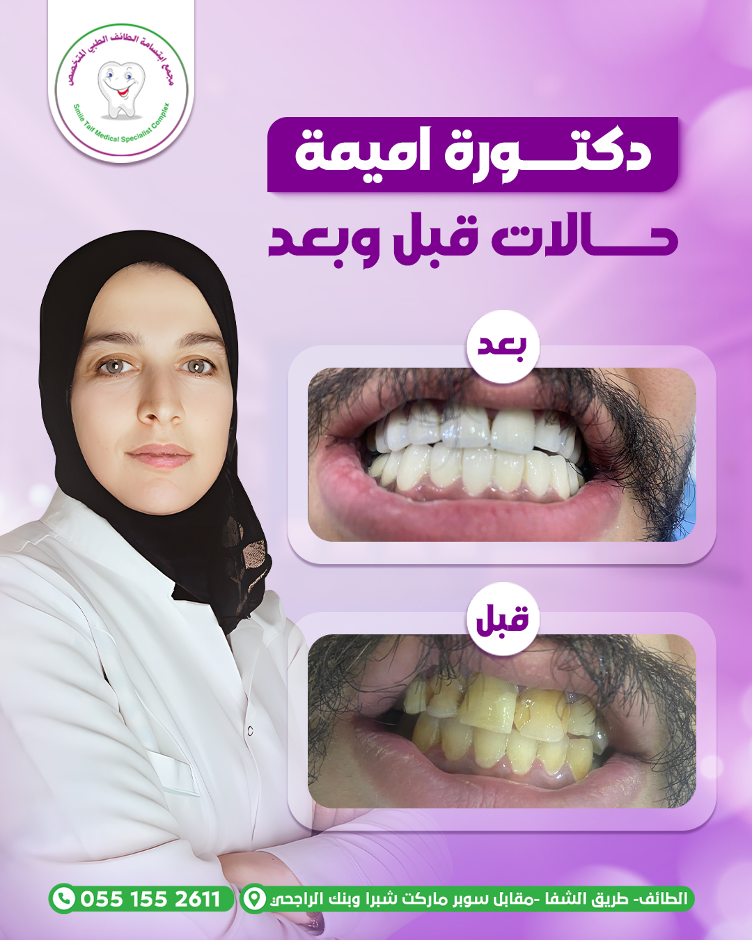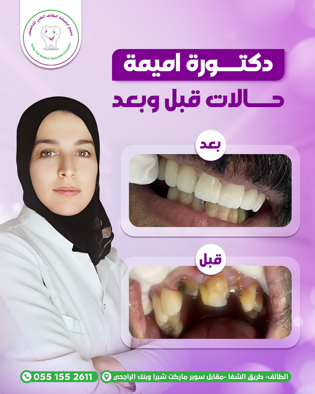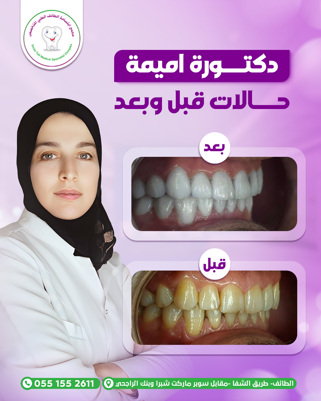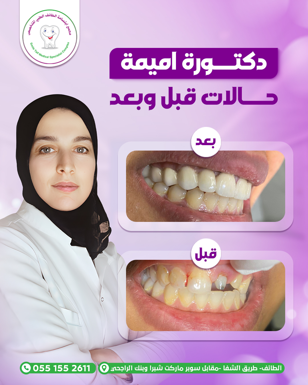 نقدّم لكم مجموعة من الحالات قبل وبعد التي تم علاجها بنجاح تحت إشراف د. أميمة، حيث نحرص على تحقيق نتائج واضحة تجمع بين الجمال الطبيعي وصحة الأسنان، باستخدام أحدث التقنيات الطبية وخطط علاج مدروسة تناسب كل حالة على حدة.